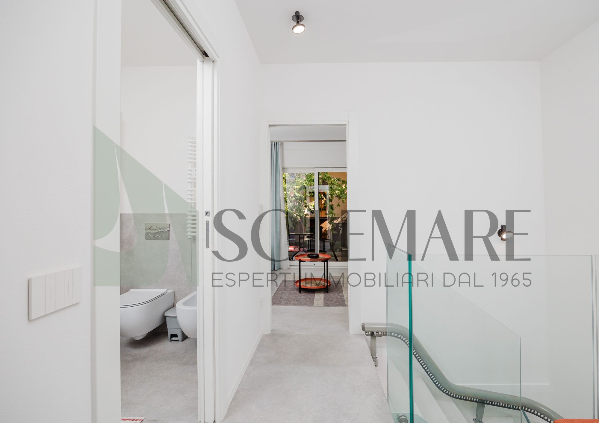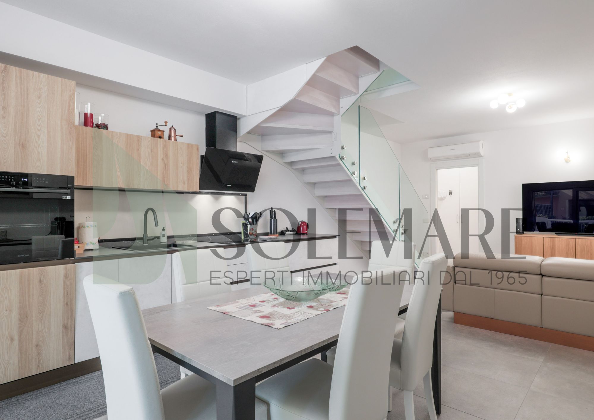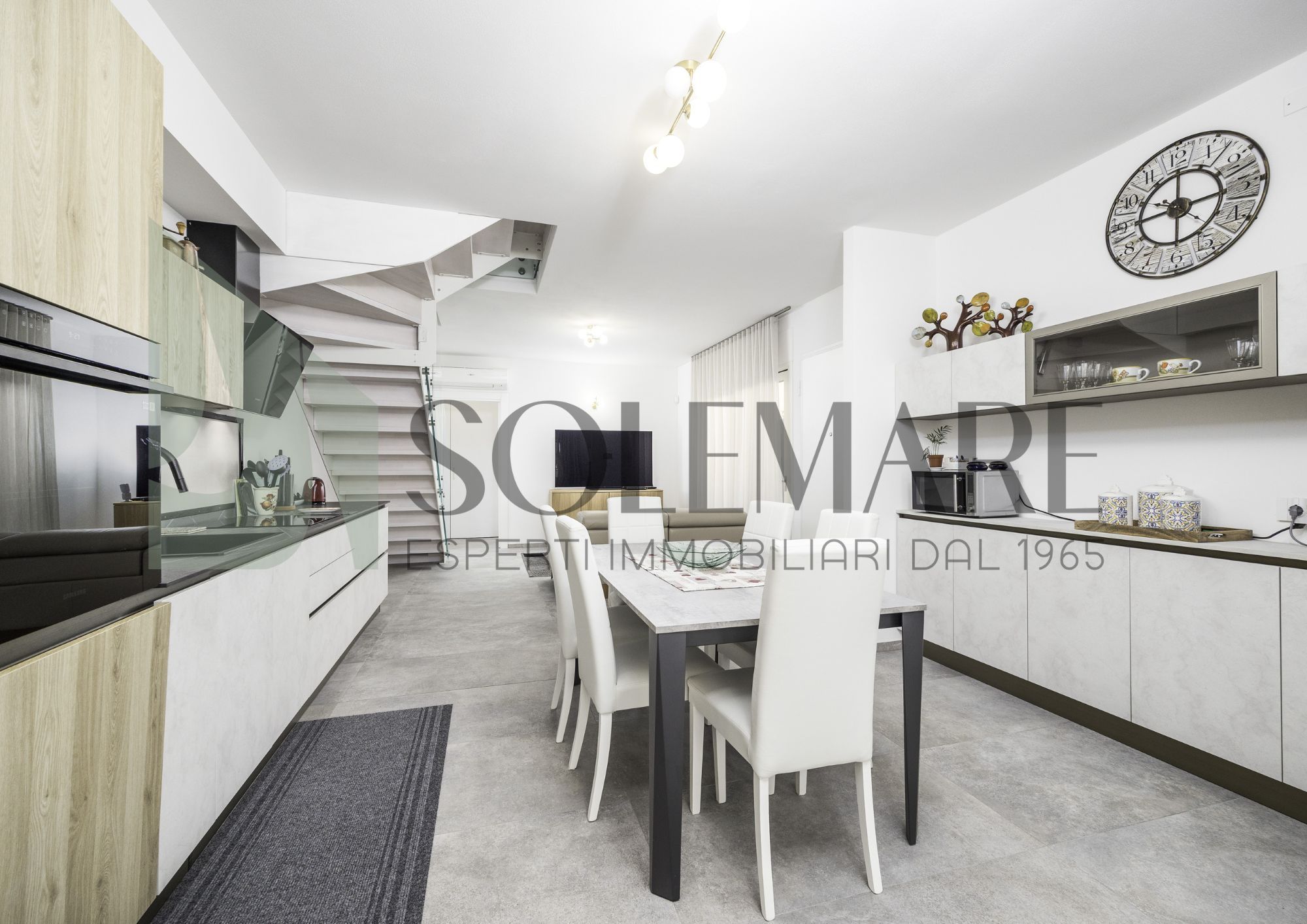 Al piano terra ingresso tramite corte privata, ampia zona giorno con cucina a vista, disimpegno-lavanderia, 1 bagno finestrato con box doccia. Tramite scala a giorno in legno e vetro si accede alla zona notte al piano primo composta da: ampio disimpegno, 2 camere da letto matrimoniali, bagno finestrato con box doccia. Dalla camera padronale accesso al balcone coperto.